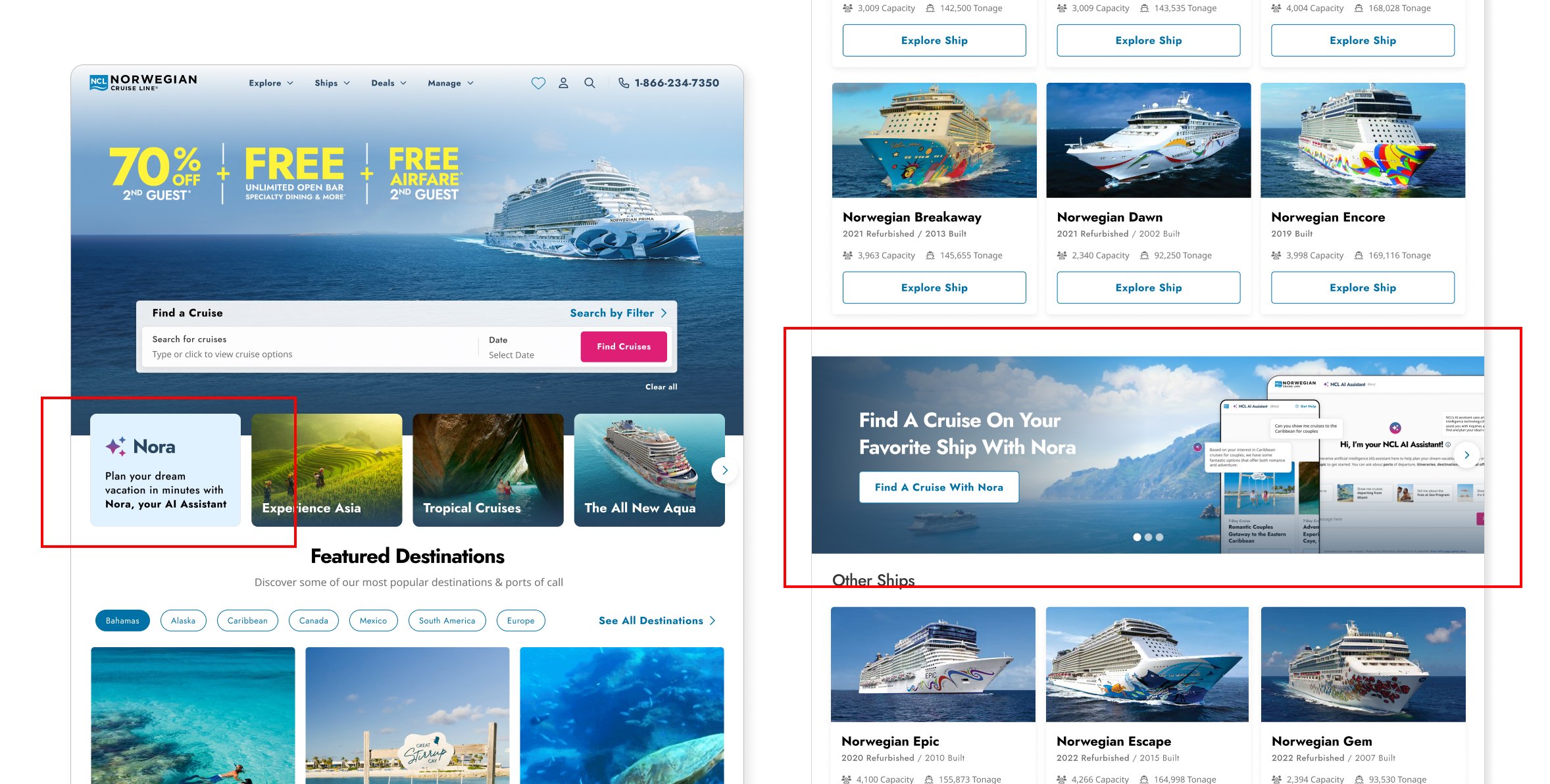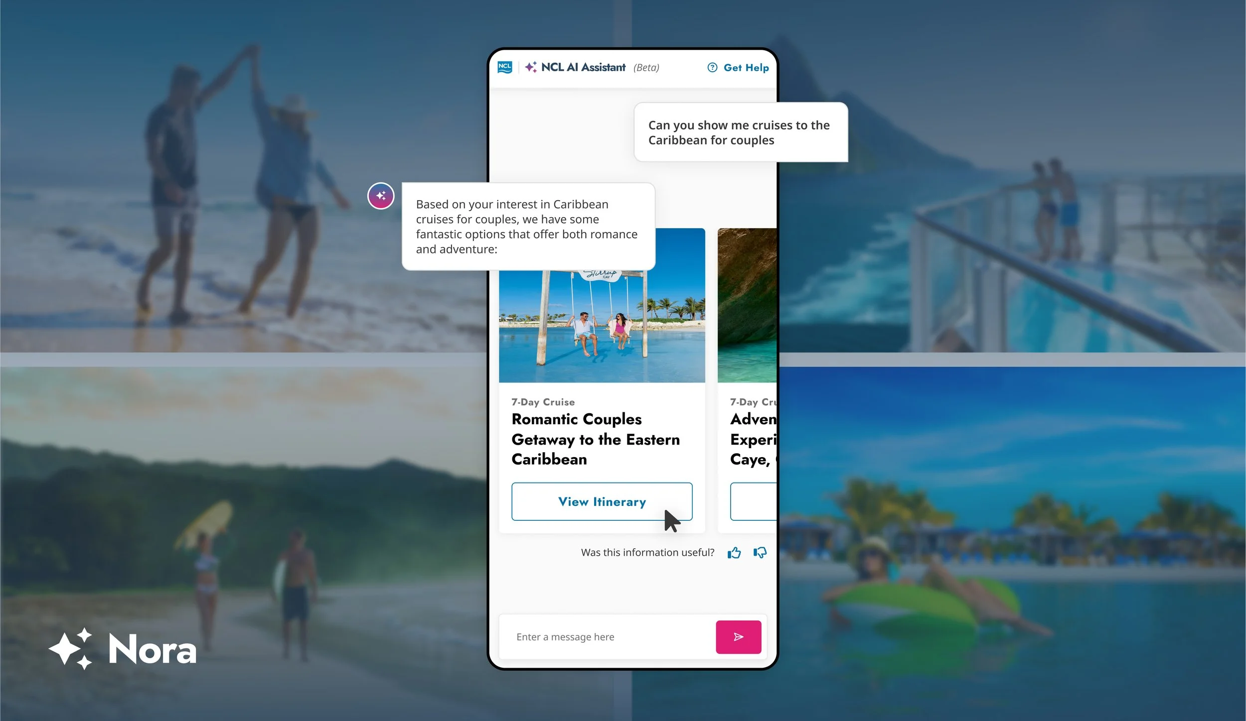 Now live and available to NCL’s website visitors across the United States, Nora has significantly reduced the complexity guests face when planning a cruise. Additionally, Nora will continue to serve as a powerful data source for NCL, allowing the cruise line to gain deeper insights into guest preferences to boost ongoing customer satisfaction and loyalty.