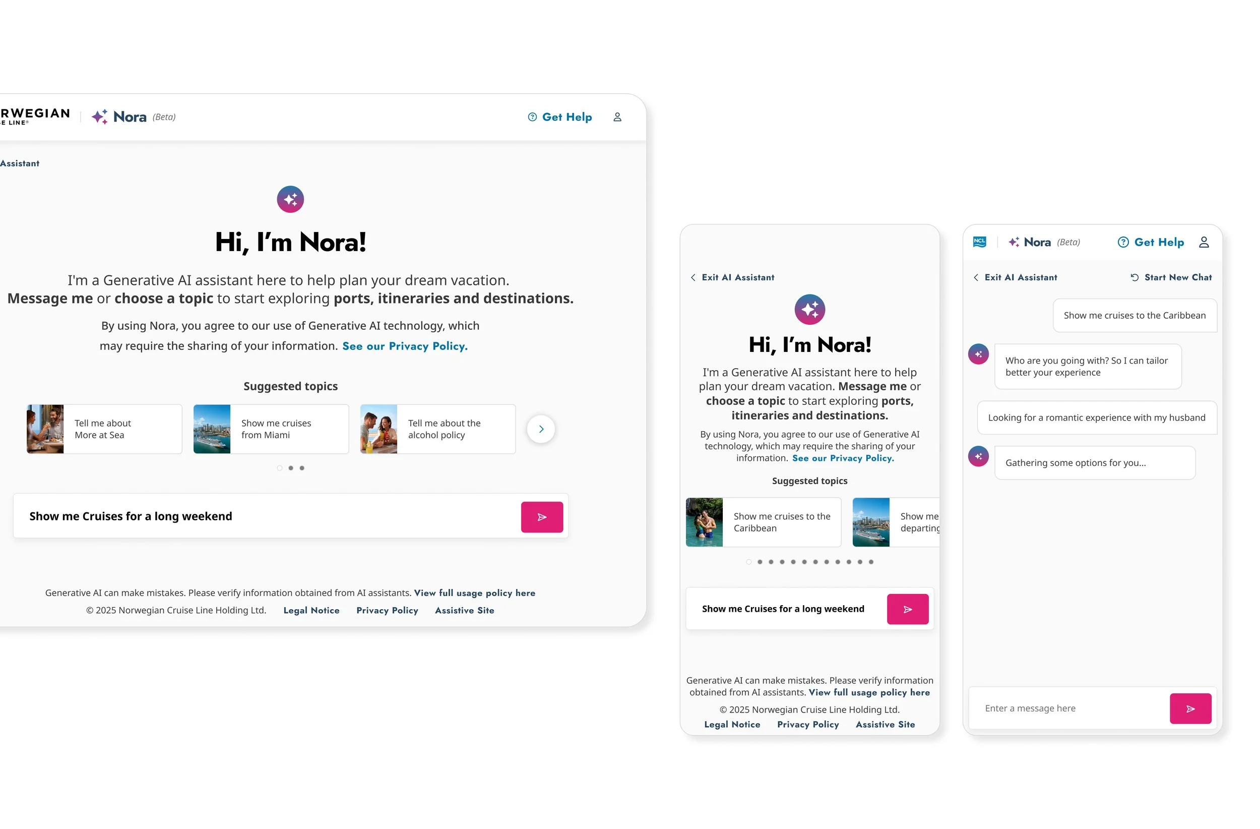 Since Nora AI was built as an external experience within Norwegian Cruise Line’s platform, I led multiple discovery rounds to identify the most strategic, contextual entry points—ensuring the tool surfaced at moments that aligned naturally with user intent and needs.