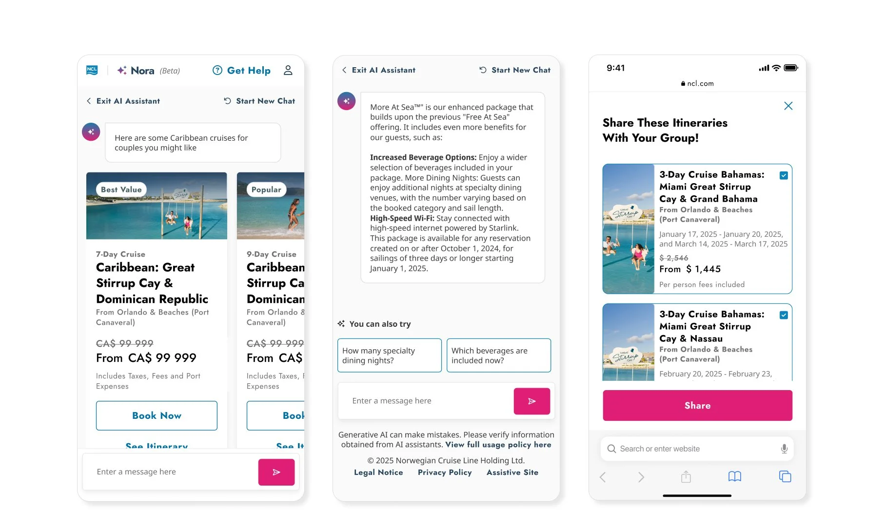 • Guests can simply ask Nora for a family-friendly cruise packed with shore excursions and great value, and she’ll instantly suggest tailored options that match their preferences.
