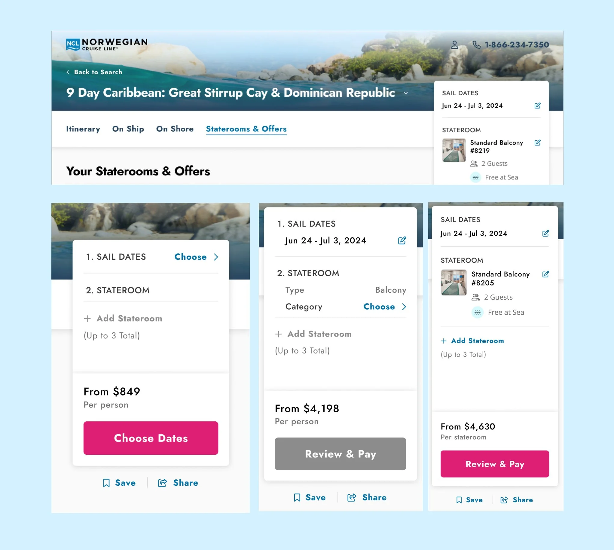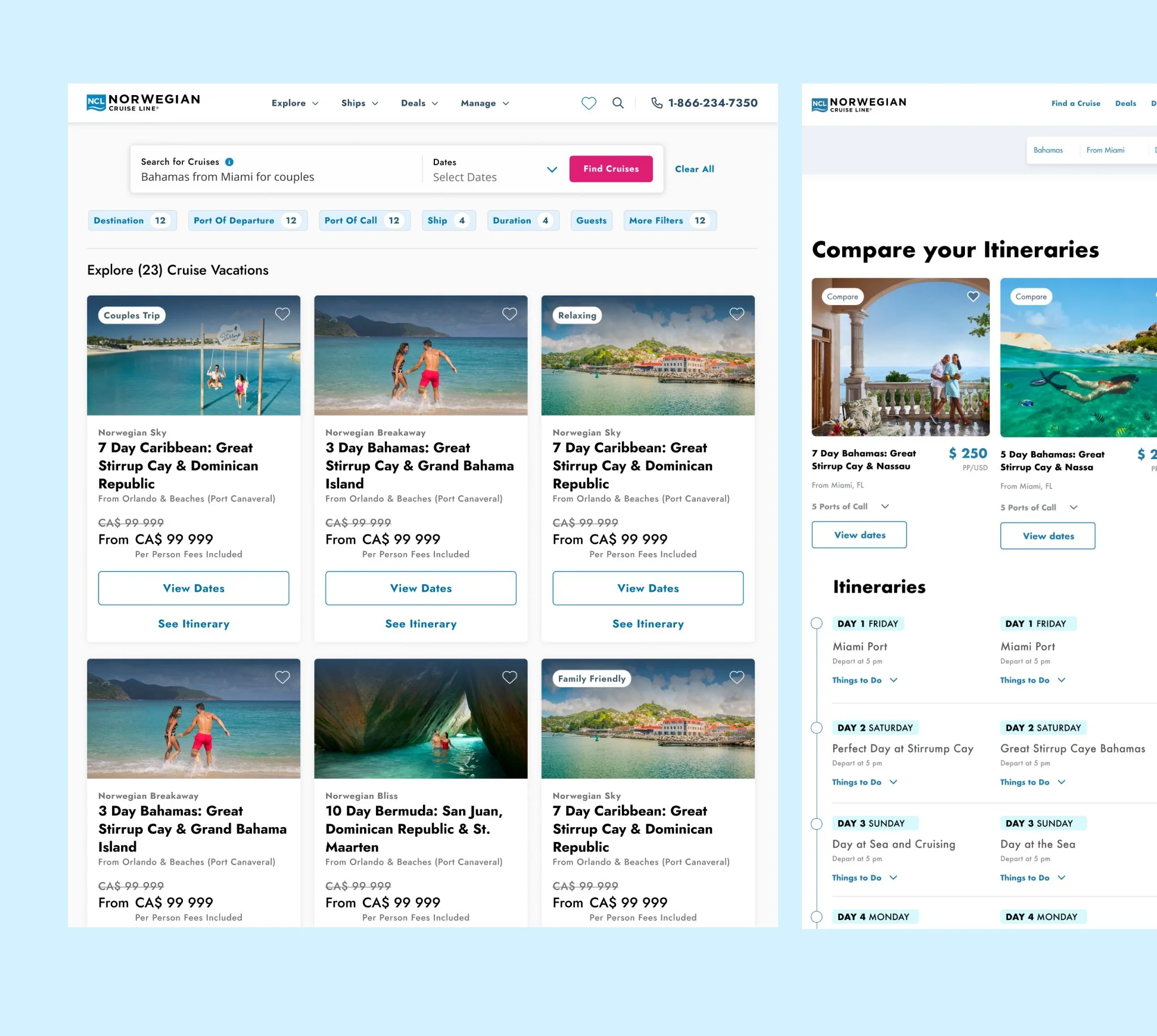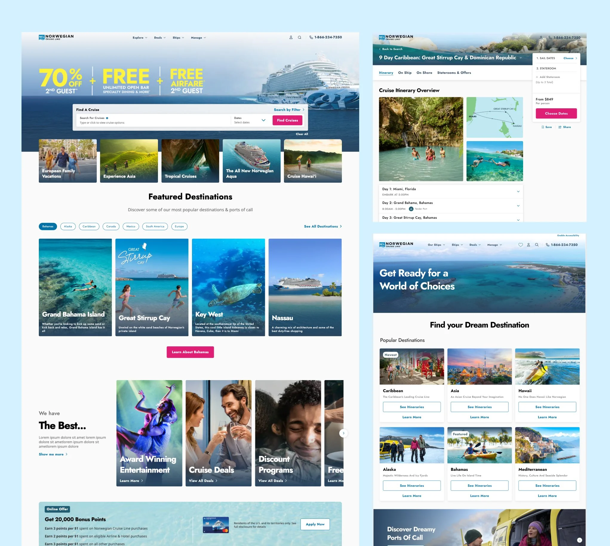 The team and I conducted an extensive and robust discovery phase to dive deeper into the current product and identify overall challenges in the industry. With NCL’s leadership product teams and researchers, we identified key strategies to improve the product experience and encourage new behaviors that will bring to life the new vision for Norwegian Cruise’s main client-facing platform.