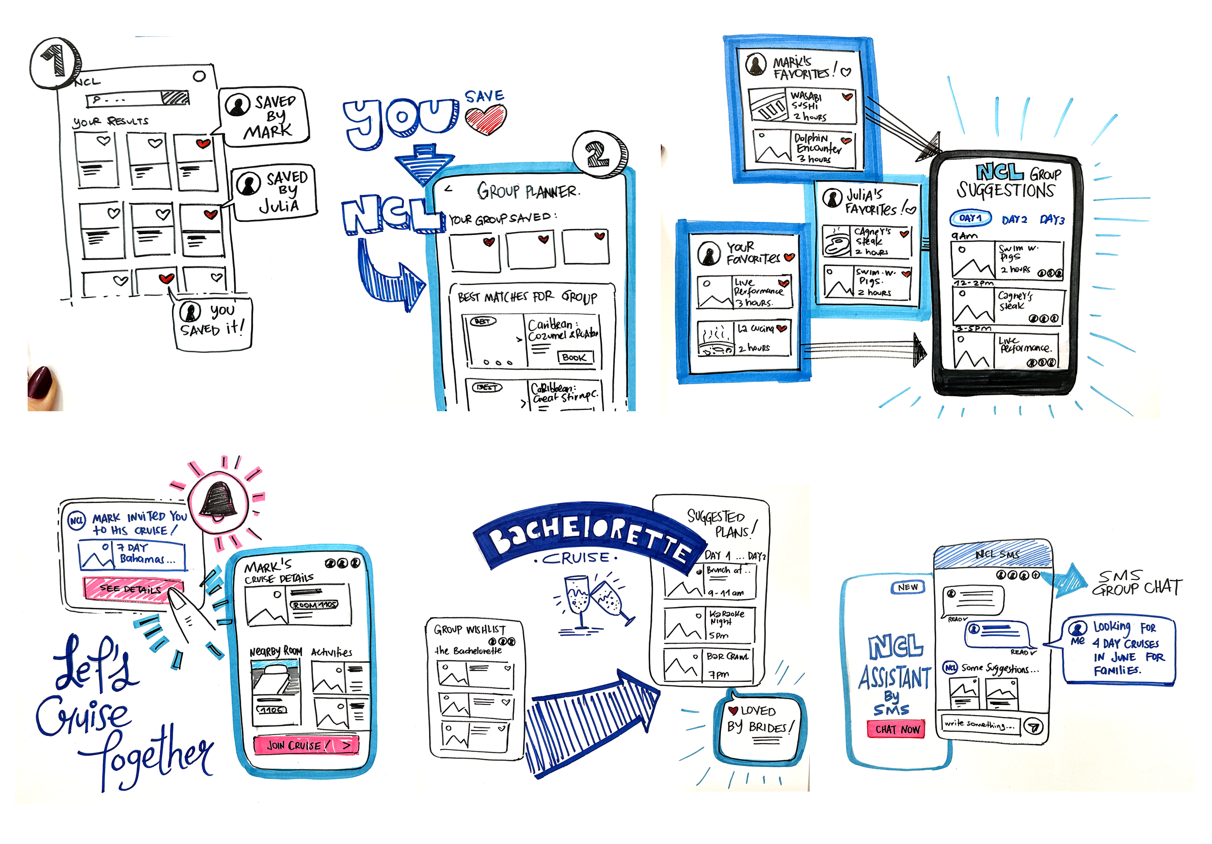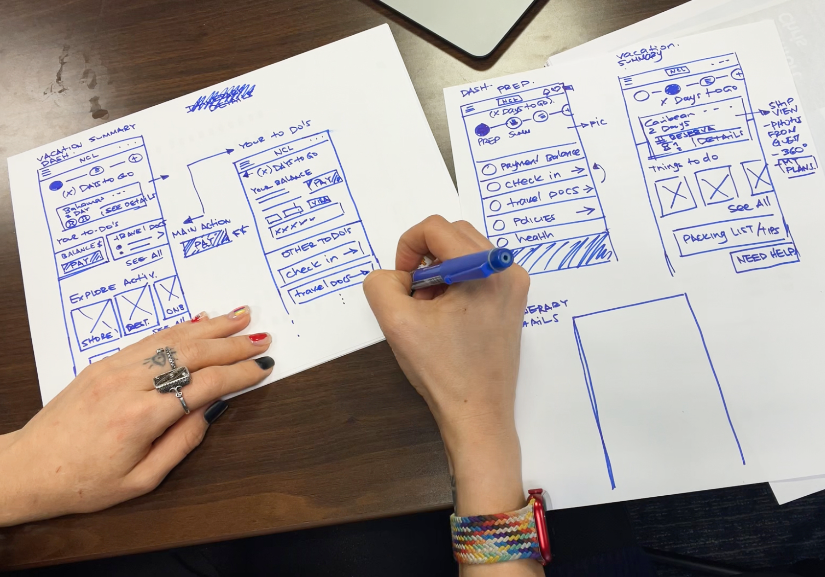 We also brought hand-made sketches to the port to save time in hi-fi mockups to rapidly test concepts we wanted to include in the cruise experience.