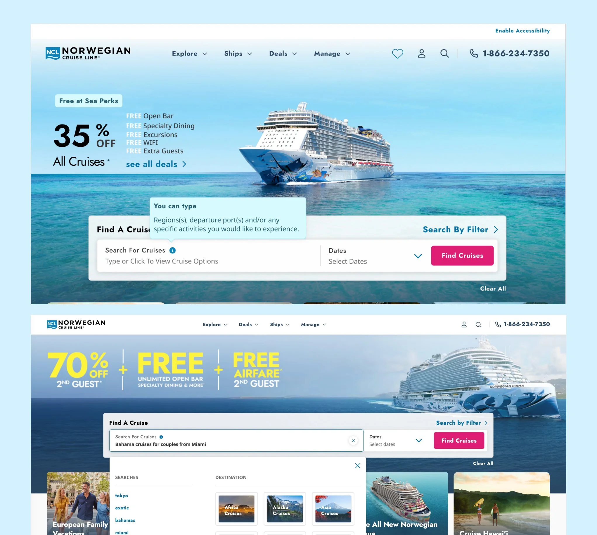 Outcomes: increase conversions in the booking funnel, and reduce users' actions/clicks from searching for a cruise to booking it. Create a seamless and personalized experience for users as we simplify the experience.