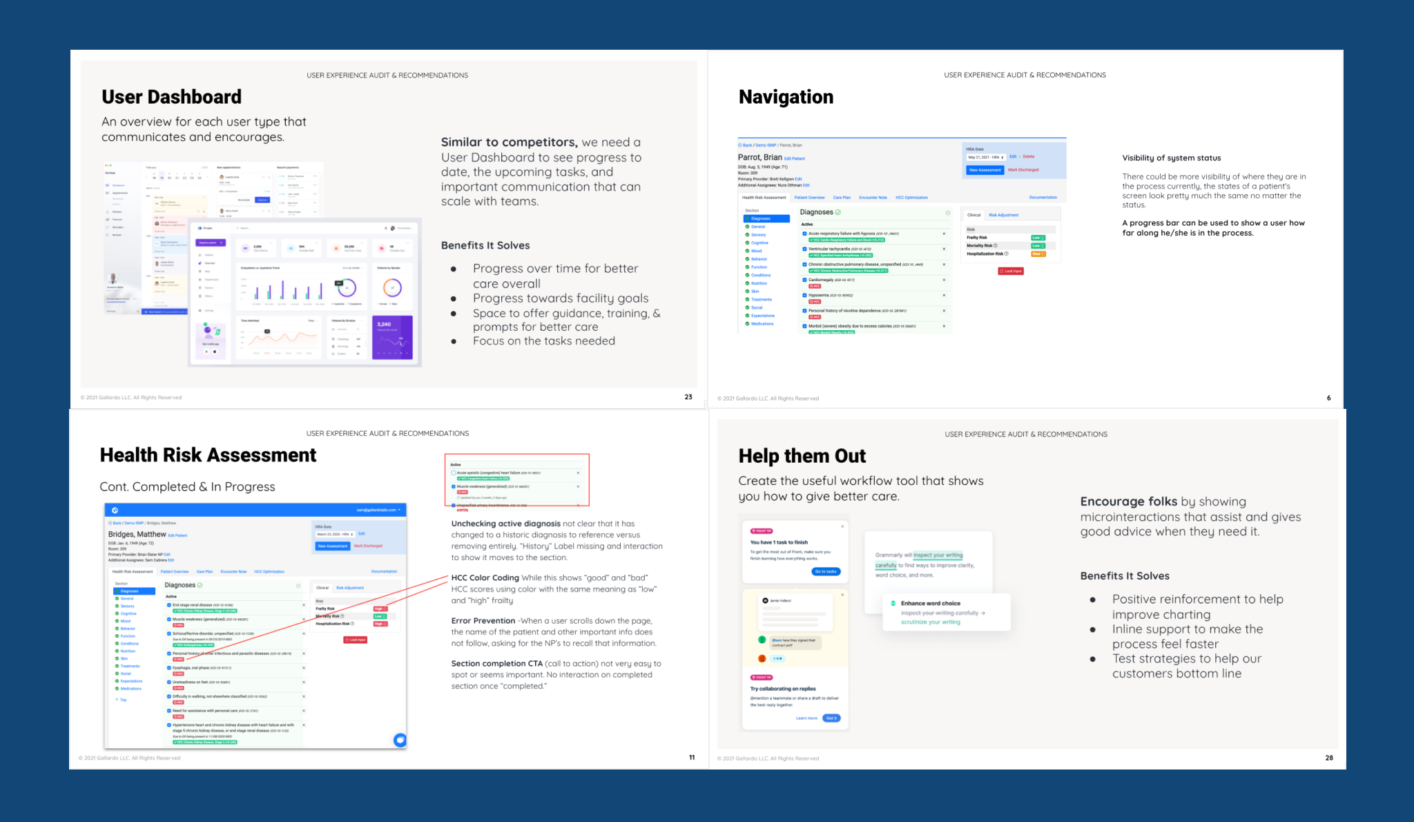 Followed by tons of research from direct competitors, user journeys, feature exploration, documentation in collaboration with the client, and deep analysis, we were able to bring a UX audit for the current Web/App called “Care Coach.” That way, provide best practices and recommendations that would bring new opportunities to improve the platform.