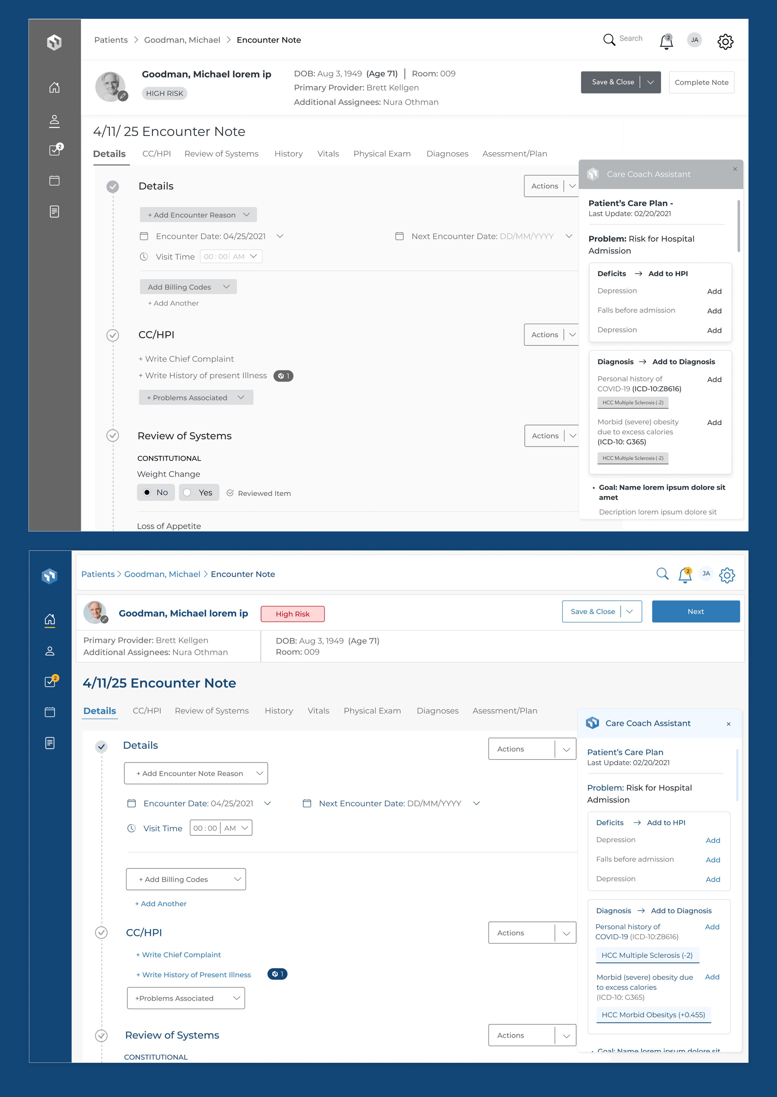 • Primary Goal: Help to improve coding (Scores). RAFF and HCC score by 20%-30%. By creating great patient assessments, insurance and medical professionals receive fair pay.