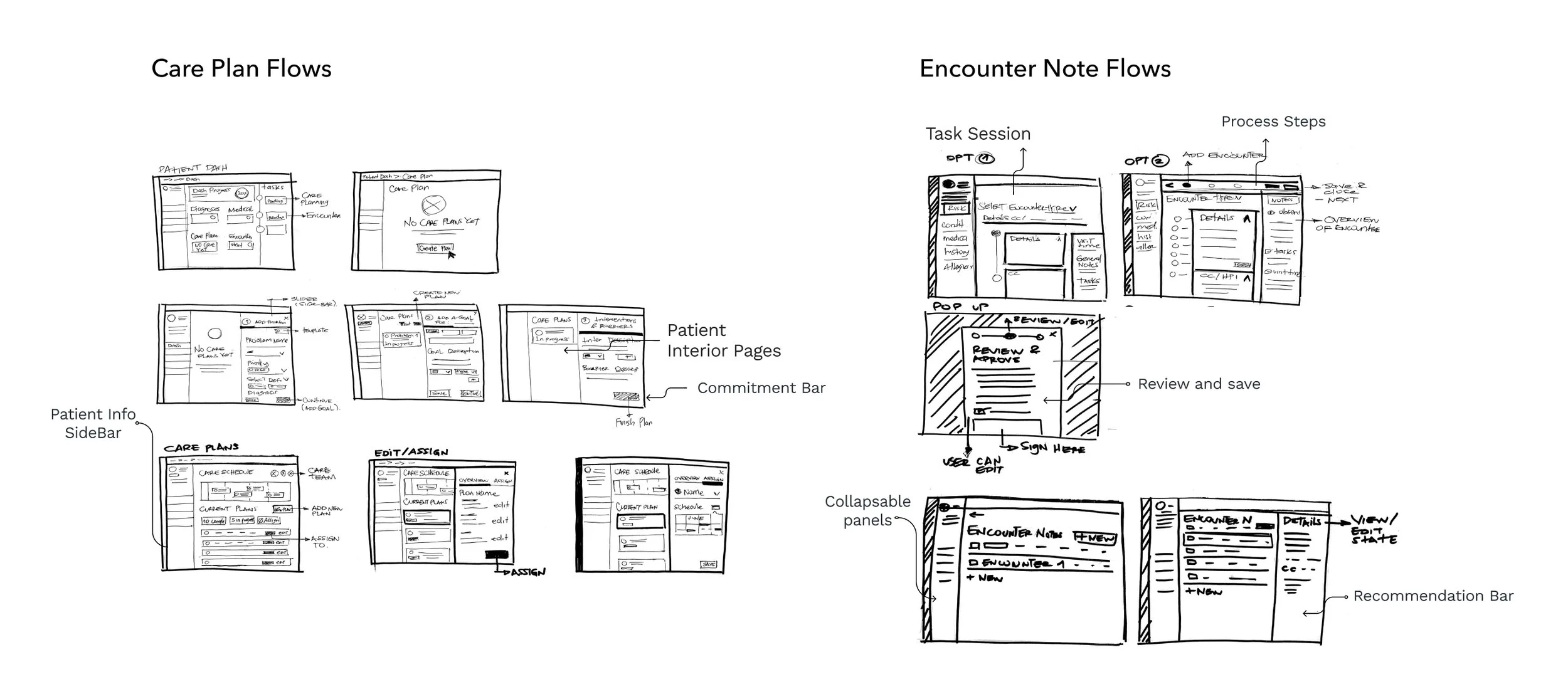 With user flows created by another team member, I started to define the interaction patterns that the different site screens will have in common with low-fi sketches. As a result, development and design time get more efficient, and users can begin recognizing how to use the platform, improving the experience.